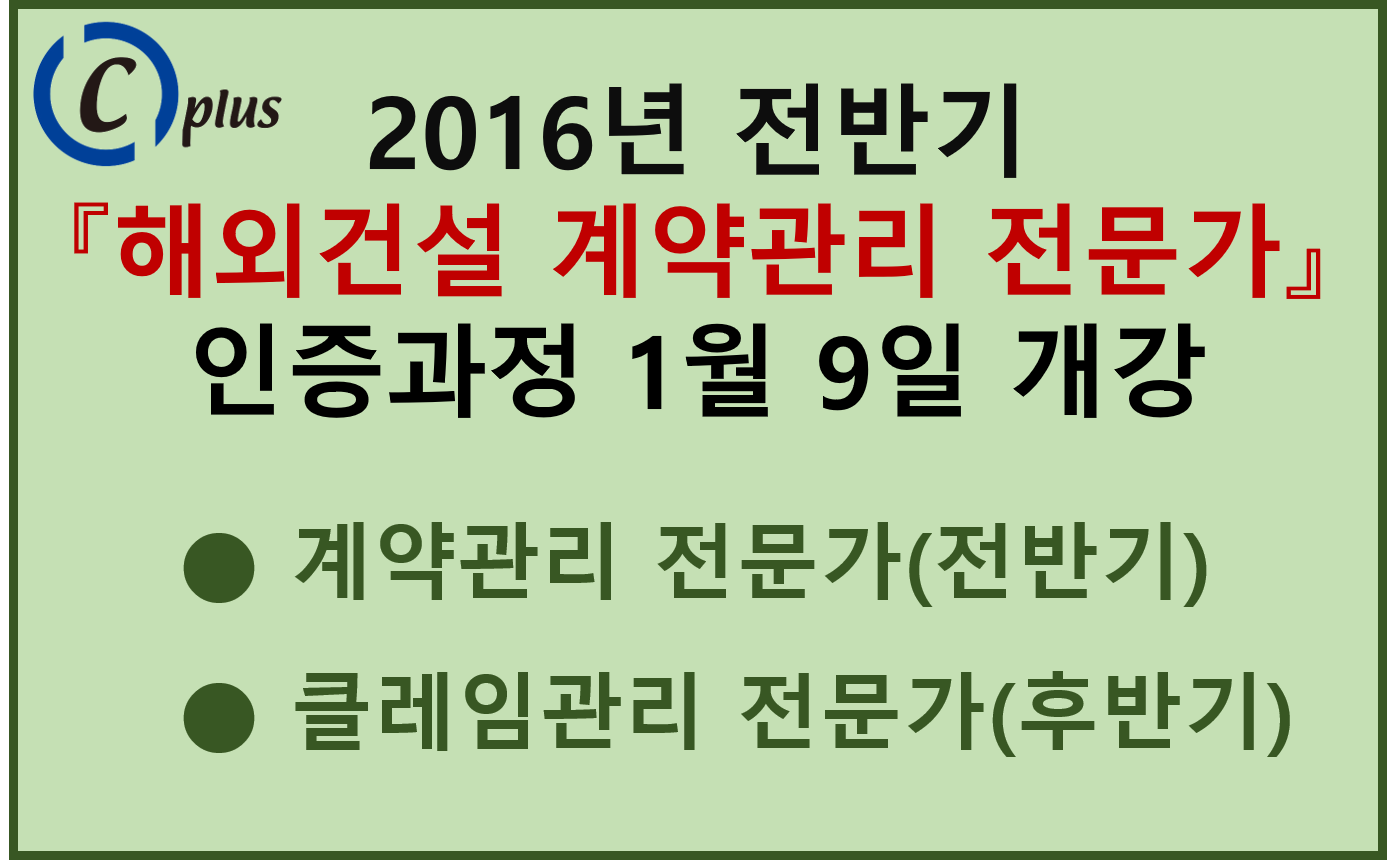 여러분 안녕하세요. ㈜씨플러스인터내셔널에서 운영하는 씨플러스아카데미에서 2016년 전반기 프로그램 『해외건설계약관리전문가(Contract Administration Professional)인증과정』이 1월 9일 개강되었습니다. 아울러 후반기에 진행되는 『해외건설계약및클레임전문…